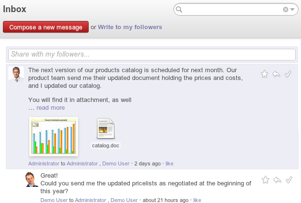 - Mensajes "de información": puede recurrir a ellos si necesita información específica; no es obligatorio leerlos cada día. Solo recibe aquello que ha decidido seguir. Estos mensajes conforman el 90 % de sus correos electrónicos diarios. Use el menú "Bandeja de entrada" para gestionarlos.